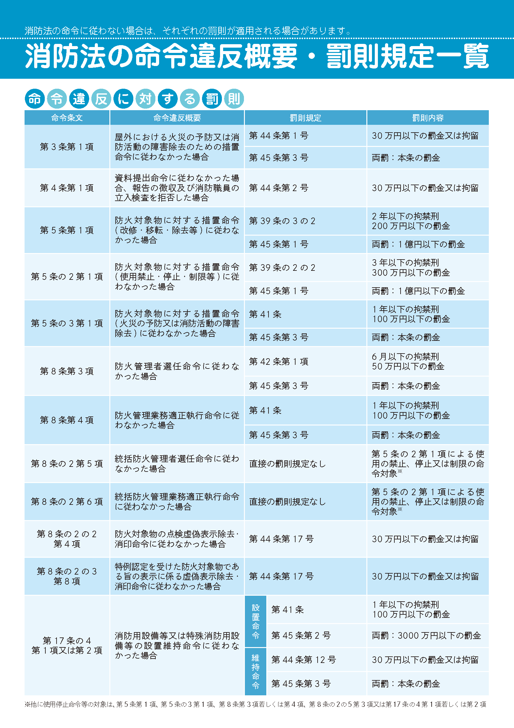 消防法の命令違反概要・罰則規定一覧