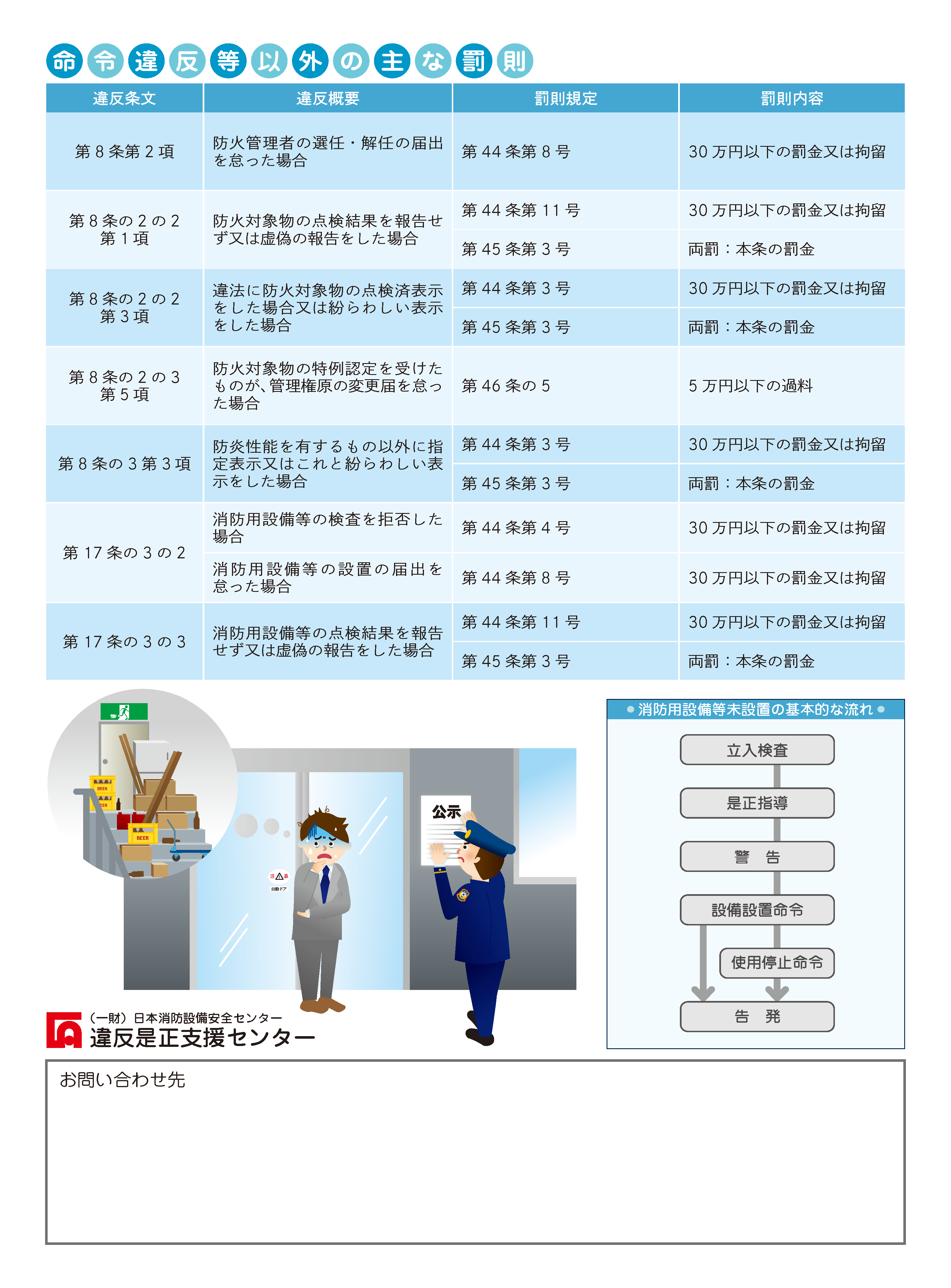 当組合のホームページに建物の違反情報を掲載し、建物の危険性をお知らせします。また、消防法に基づく、命令や告発による罰則を受ける場合があり、命令を受けると当該建物の出入口に、消防法に基づく命令を受けている旨の標識が設置されます。